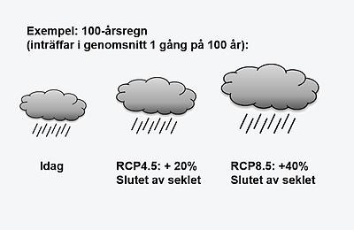 Nedan ser du ett diagram som illustrerar ett 100-årsregn. Det första scenariot RCP 4.5 utgår ifrån att utsläppen ökar ungefär fram till mitten av seklet och minskar därefter då världen lyckas genomföra vissa klimatåtgärder, men inte de mest ambitiösa. I det andra scenariot RCP 8.5 fortsätter utsläppen öka kraftigt under hela 2000-talet.