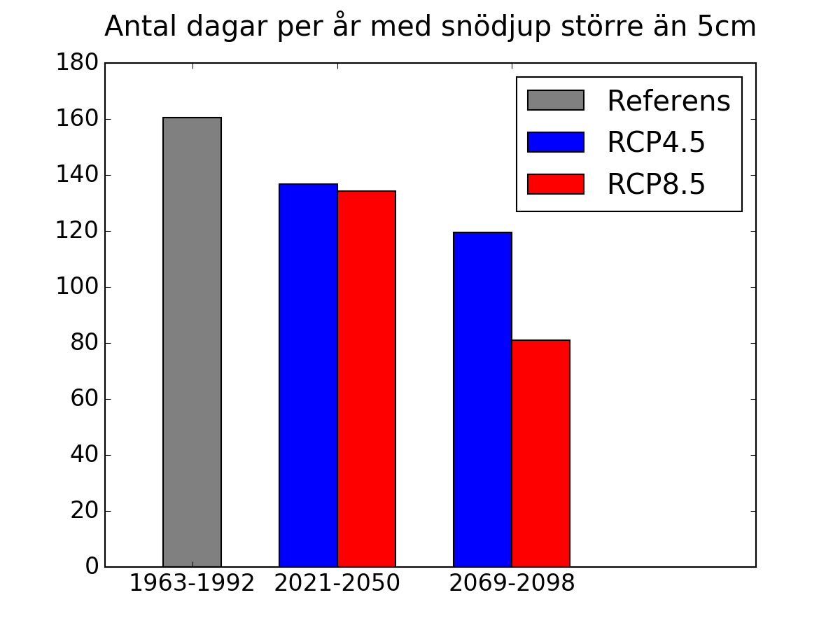 Diagram från SMHI som visar genomsnittligt antal dagar per år med snödjup större än 5 cm i Umeå tätort. Medelvärde för referensperioden 1963–1992 samt 2021-2050 och 2069-2098 enligt RCP4.5 och RCP8.5.