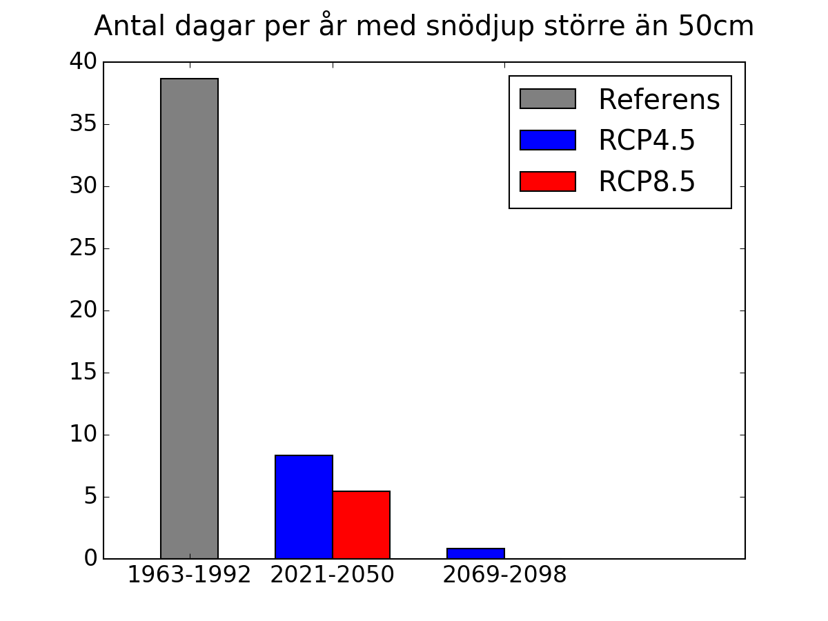 Diagram från SMHI som visar genomsnittligt antal dagar per år med snödjup större än 50 cm i Umeå tätort. Medelvärde för referensperioden 1963–1992 samt 2021-2050 och 2069-2098 enligt RCP4.5 och RCP8.5.