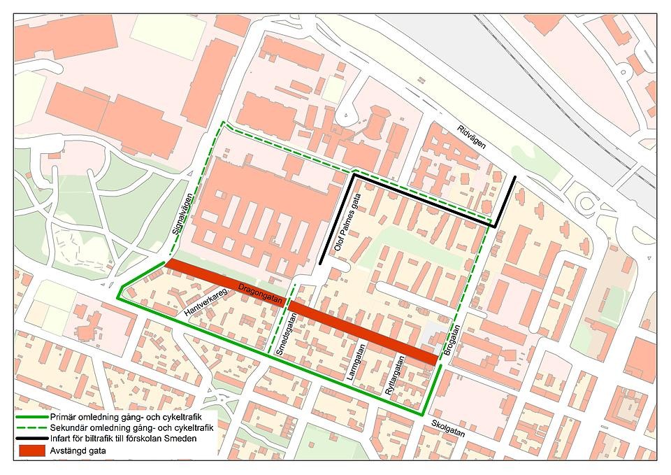 • Under byggtiden sker omledning av gång- och cykeltrafik som passerar Dragongatan till Skolgatan. Alla som har målpunkter längs Dragongatan kan ta sig fram dit.