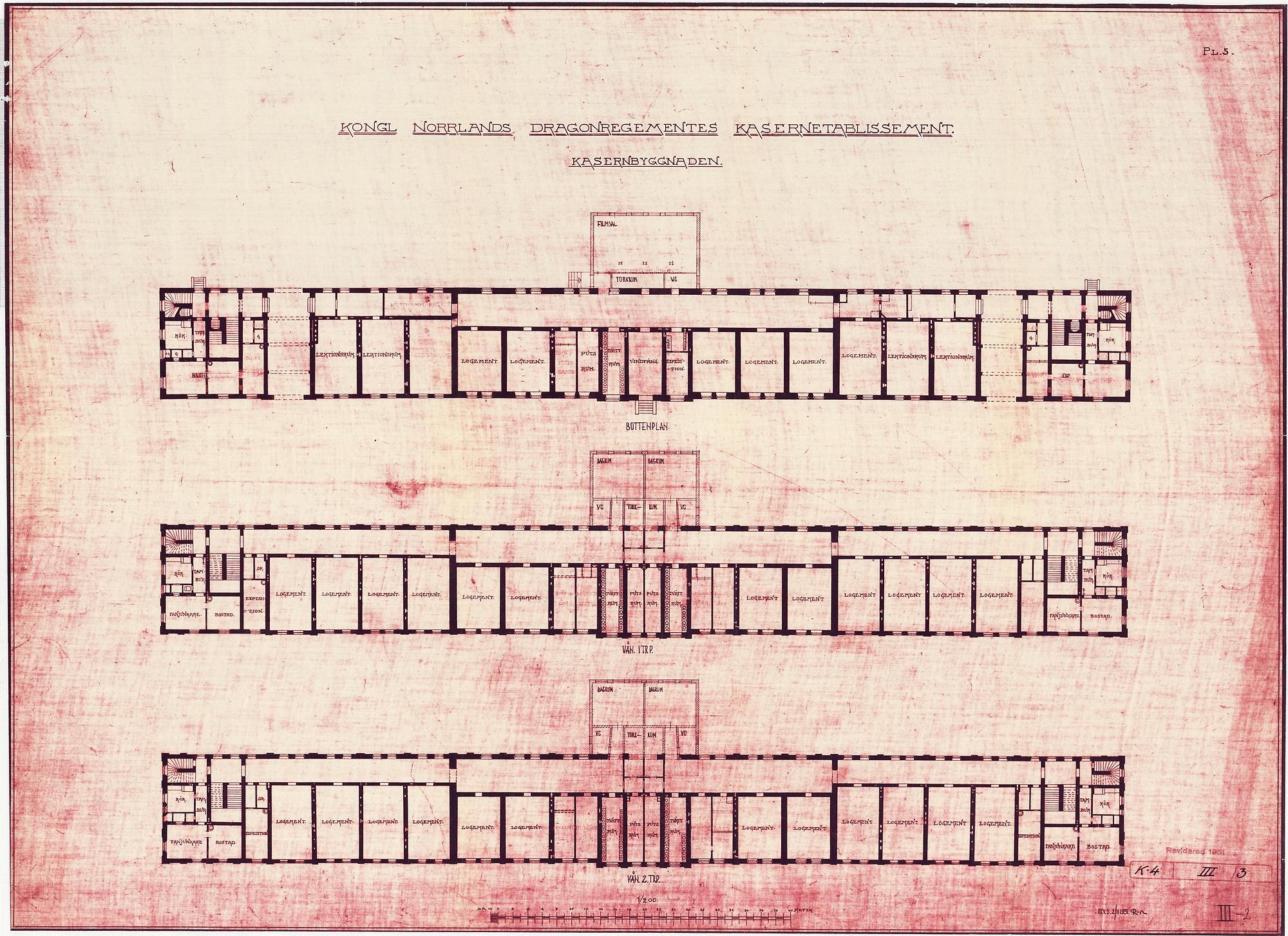 Förstora bildenRitning över kasernbyggnaden. I mitten på baksidan, alltså fasaden mot norr, syns utbyggnaden som gjordes 1943. Original tillhör Stiftelsen Regementsmuseet.
