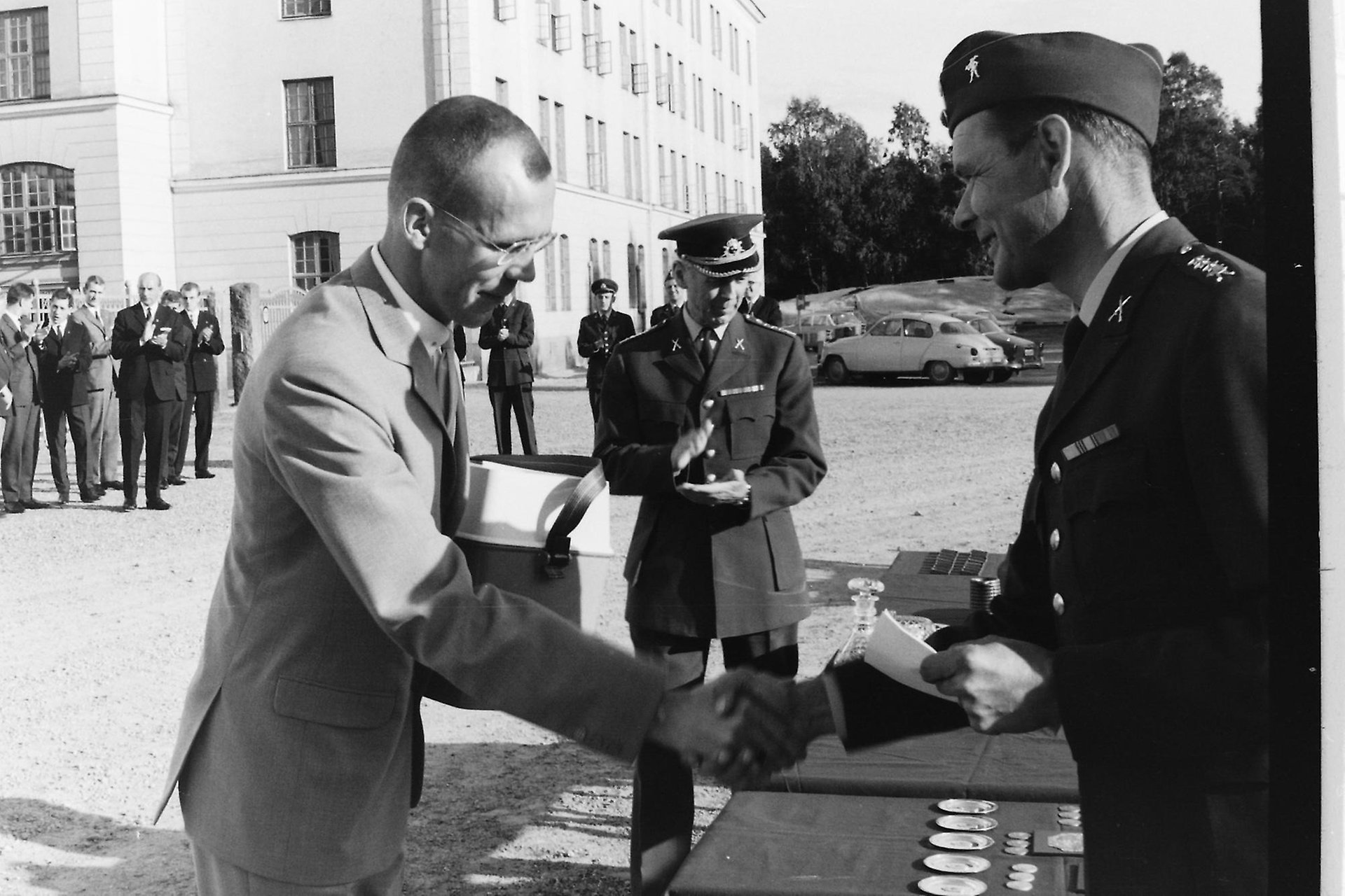 Förstora bildenSM i femkamp 1964, Lars Edstedt (till vänster) tar emot pris under prisutdelningen på I 20. Fotoägare: Stiftelsen Regementsmuseet.