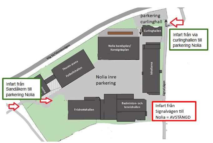 Begränsat med parkeringeringsplatser finns på Noliaområdet, med infart från väg E12 vid curlinghallen eller infart från Sandåkern (se karta nedan).