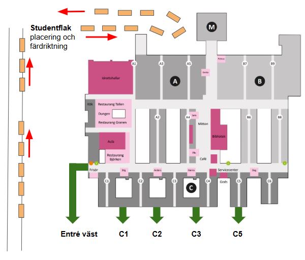 Notera att alla elever som läser en lärlingsutbildning springer ut genom Entré väst, oavsett vilket program eleven gått. Alla elever som går idrottsgymnasiet (LIU) springer ut genom utgång C2, oavsett vilket program eleven gått.