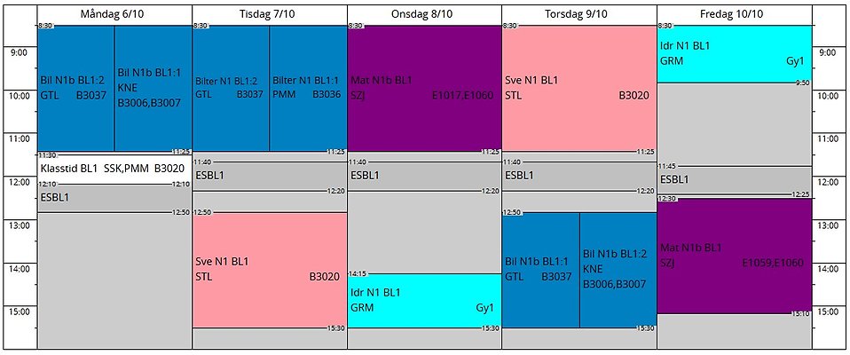 Bilden ovan visar ett exempelschema från en klass i åk1 under HT. (Variationer i elevscheman förekommer mellan program och årskurser).
