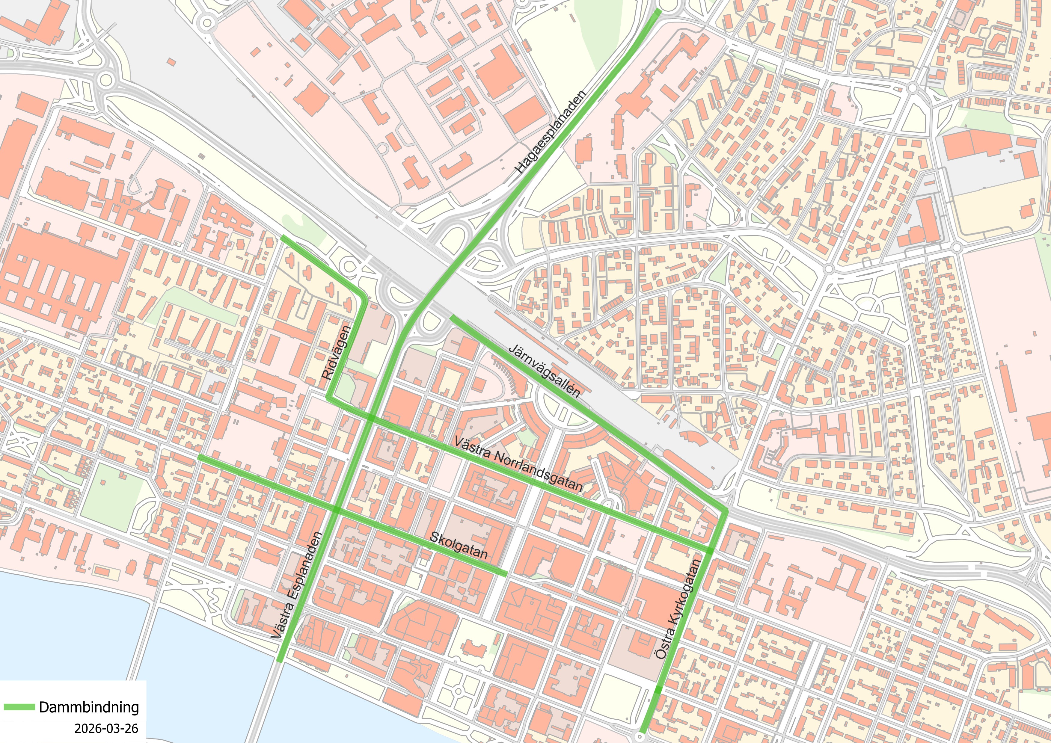 Förstora bildenKarta som visar gator där dammbindning sker. Klicka på bilden för att göra den större.