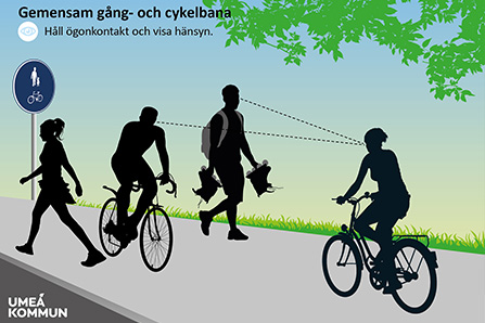 På en delad/separerad gång- och cykelbana ska du som cyklist cykla på höger sida i färdriktningen på din del av banan. Gång- och cykelbanan är separerad med vägmarkering och illustrationer som visar var du ska cykla.