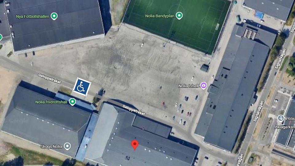 Ta av från Signalvägen och in på Noliaområdets stora parkeringsplats. Strax utanför friidrottshallens entré finns flera uppmärkta parkeringsplatser för rörelsehindrade, se kartbild nedan.