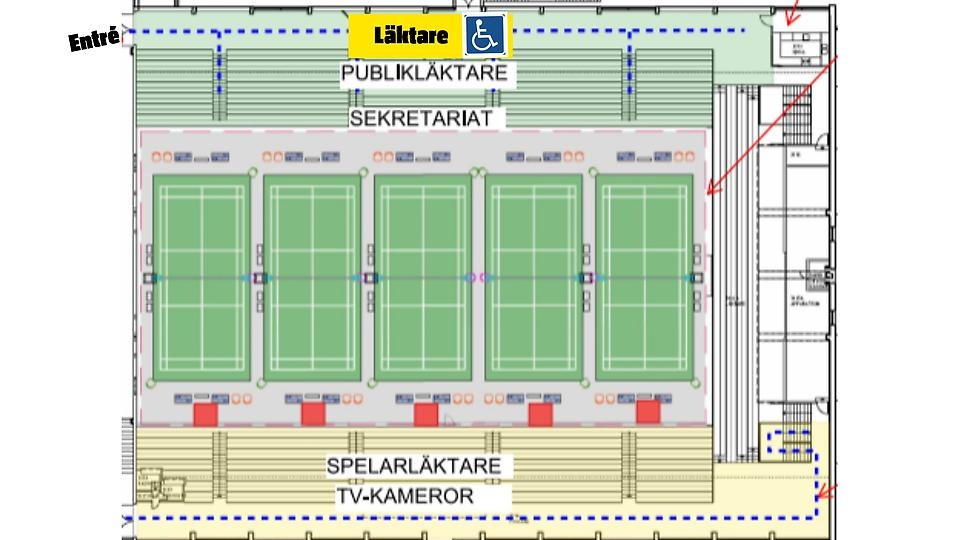 På Umeå Energi Arena Vatten finns det fyra platser för rullstolsburna på våning två i arenan. Ta hissen till andra våningen och ta första entrén in i hallen för att hitta platserna mitt på läktaren, se kartbild nedan.