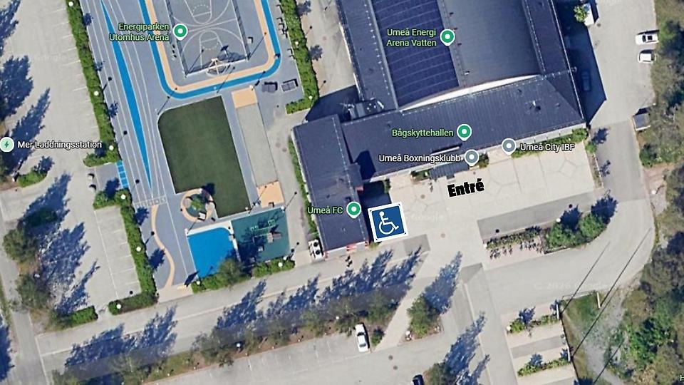 På parkeringen utanför Umeå Energi Arena Vatten finns två parkeringar för rörelsehindrade. Kör in från Gammliavägen för att hitta parkeringarna.