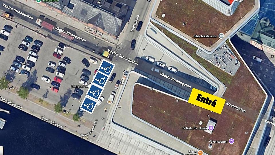 Det finns 4 handikapplatser på Vävenscenen, två på balkongen och två framför gradäng. Ta hissen upp till de två handikapplatserna på balkongen, de andra nås från entréplan rakt in. Det finns även en HWC. Mer information: Tillgänglighet i Väven Länk till annan webbplats, öppnas i nytt fönster..